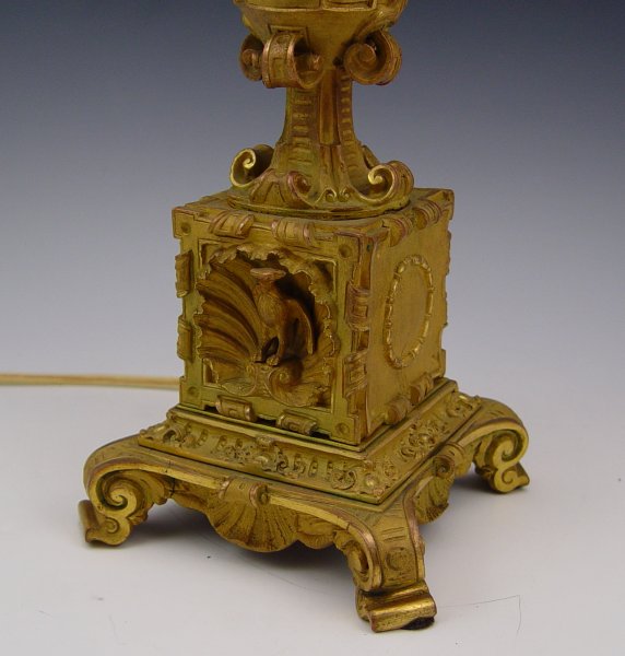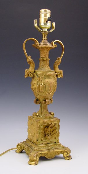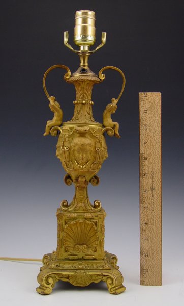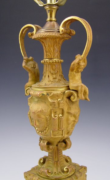 GILT BRONZE LAMP: Putti figural handles over masquerons. Base is 15'' tall excluding the socket. Rewired for safety.
