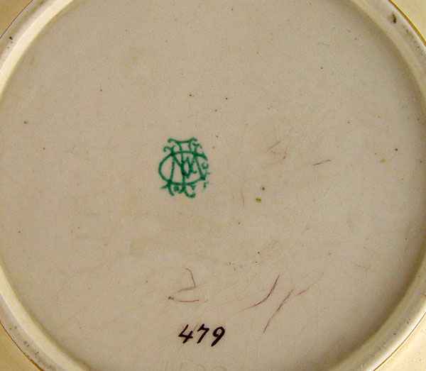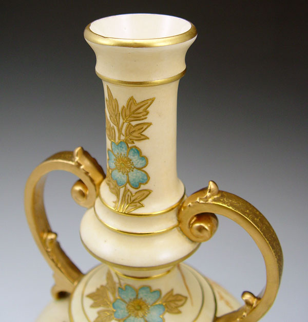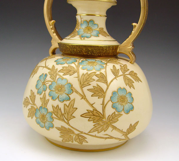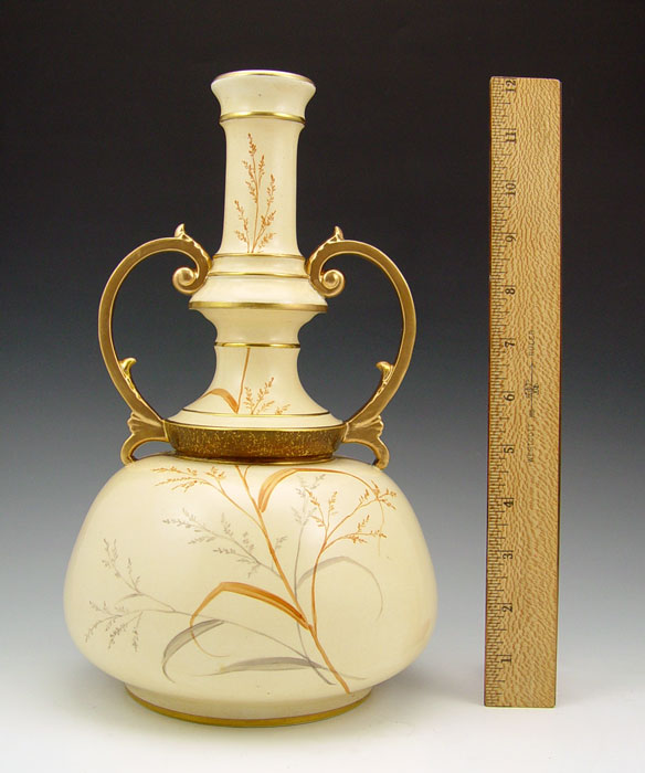 LARGE FAIENCE MFG. GILDED VASE: Faience Manufacturing Co. The mark indicates circa 884-1890, while under the artistic direction of Edward Lycett. Bottle neck vase, enamel and gold decoration. 12'' tall.