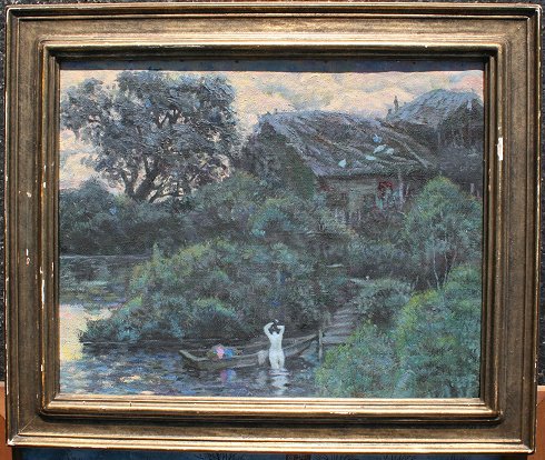 ILLEGIBLY SIGNED BAYOU SCENE WITH NUDE WOMAN: OIL/Canvas, 16'' x 20'', carved and gilded period frame with wear, 21 1/2'' x 24 1/2''.