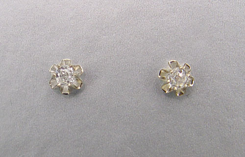 PLATINUM .33 CTW DIAMOND SOLITAIRE EARRINGS: Platinum diamond solitaire earrings contain two old mine cut diamonds. WEIGHT: .33 Ct. Approx. The diamonds average SI-I1 in clarity and G-H in color. The diamonds are prong set in buttercup mountings. Post and nut closures. Weight: 1.0 grams.