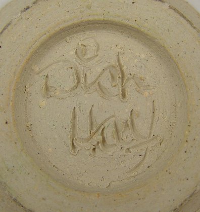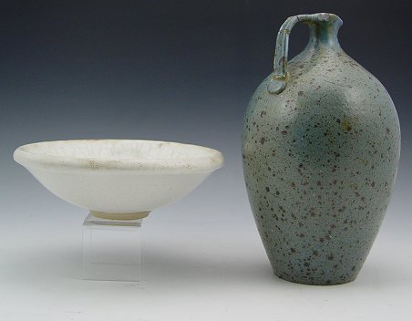 HAY, Dick, (American, 20th c.): 2 piece pottery lot, glazed bowl, 7 1/2'' d. x 2 1/2'' h., incised signature; glazed handled ewer (note repair), 10'' h., signed on the base.