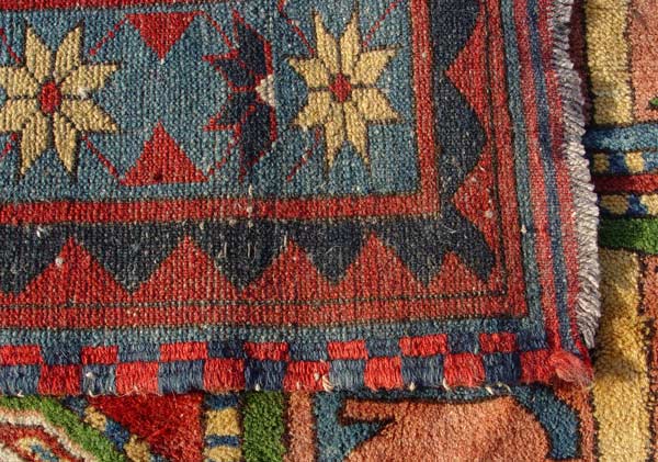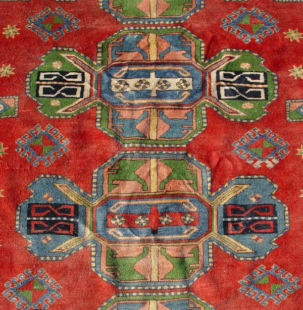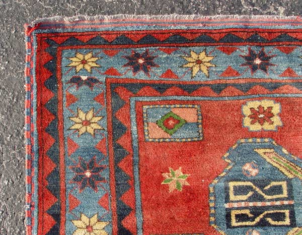 CONTEMPORARY TURKISH KAZAK RUG: Approx. 6' 5'' x 5' 3'', red ground with blues and greens.