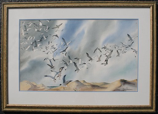 ANDERSON, Ruth, (American, 20th c.): Beach scene with Gulls, Watercolor, sight size 16 1/2'' x 28'', signed, framed, 26'' x 38''.