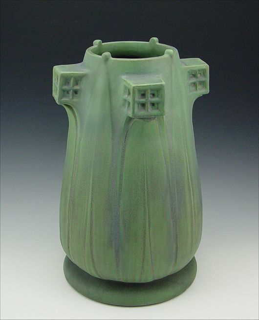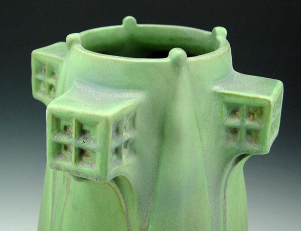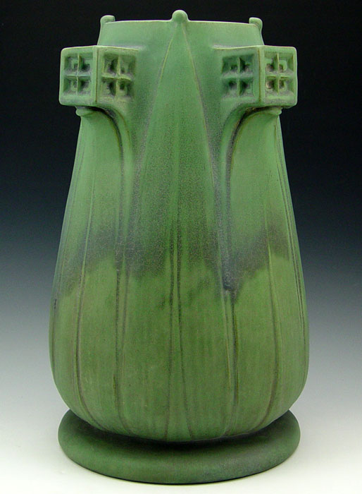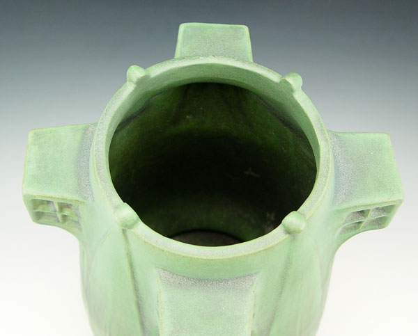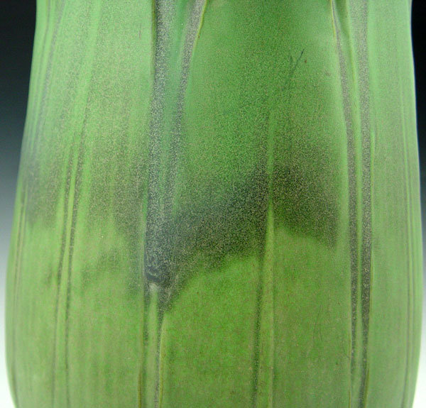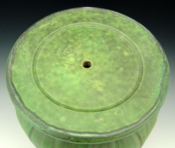 TECO POTTERY VASE DEIGNED BY ORLANDO GIANNINI: Impressed with 167 and the Teco trademark. Green matte glaze. Drilled as for a lamp. 16 1/2'' tall, 11'' dia.
