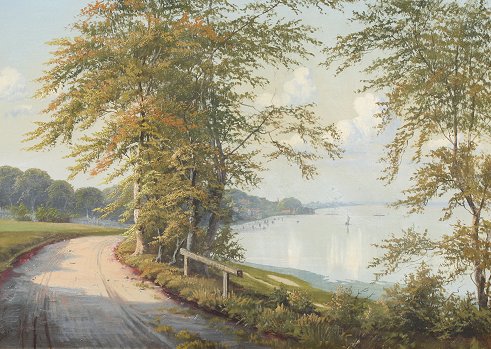 E NIELSEN DANISH LANDSCAPE PAINTING: OIL/Canvas, 26'' x 36'',The path leading to the village, along the lake, framed, 32'' x 42''.