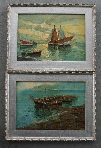 2 ITALIAN PAINTING SIGNED G. BARTLETT: Fishing Fleet and Fisherman Leaving Shore, Oil/board, 10'' x 13 3/4'', one is signed, framed, 13'' x 17''.