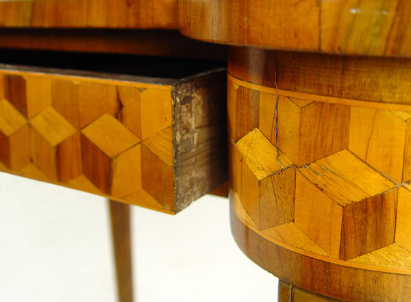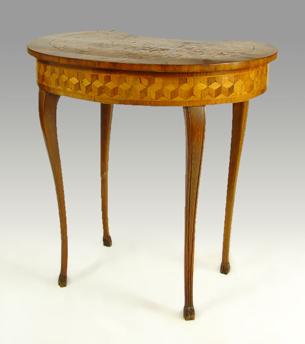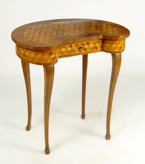LATE 19TH C. PARQUETRY INLAY KIDNEY SHAPED DRESSING STAND: Tumbling block cubic illusion parquetry pattern. Single drawer stand raised on slender cabriole legs and pad feet. 30'' tall x 29 1/2'' x 22'' deep.