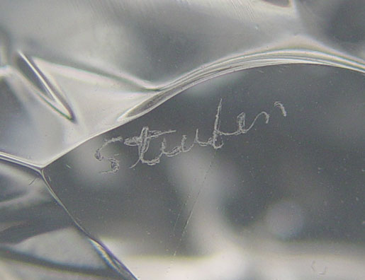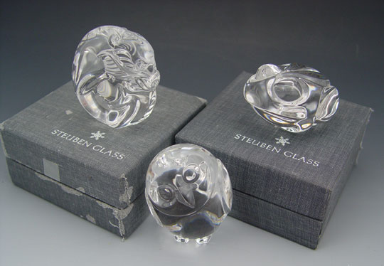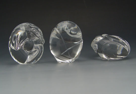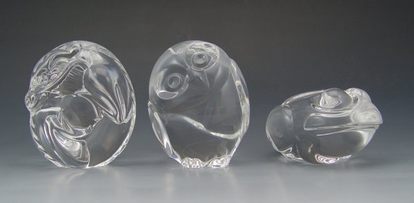 3 SIGNED STEUBEN GLASS HAND COOLERS: Owl, Frog and Dragon. Each approx. 2 1/2''. Two original boxes in worn condition.