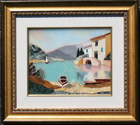 FLORENTINE MOSAIC BY BINI IMPRESSIVE MOSAIC OF LAKE COMO: 8 1/2'' x 11'', Alabaster and semi-precious stones, framed, 16'' x 18''.