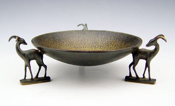 HAGENAUR ART DECO BRONZE GAZELLE FIGURAL DISH: Attribution. Hammered texture supported by a trio of a gazelles. 2 1/8''h x 6'' dia.