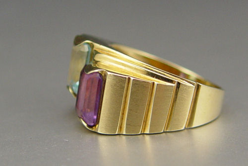 AMETHYST AND TOPAZ RING: 14K yellow gold ring contains an emerald cut amethyst and blue topaz. WEIGHT: 3.00 Ct. Approx. The gemstones are prong set. Weight: 6.4 grams. Size: 8