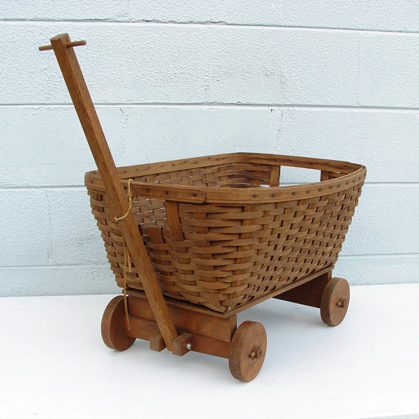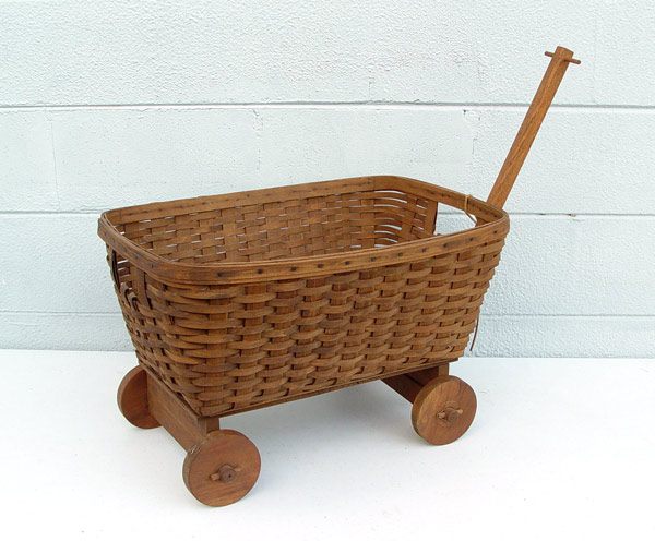 LARGE LONGABERGER BASKET ON WAGON: Name and year hidden by wagon. Very unique and rare. 25'' h. x 28'' x 17 1/2''.