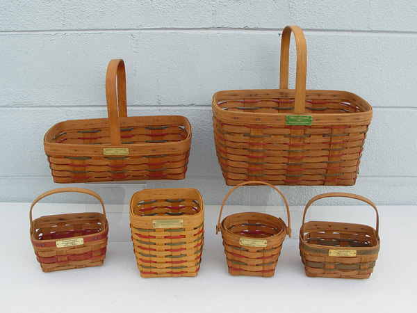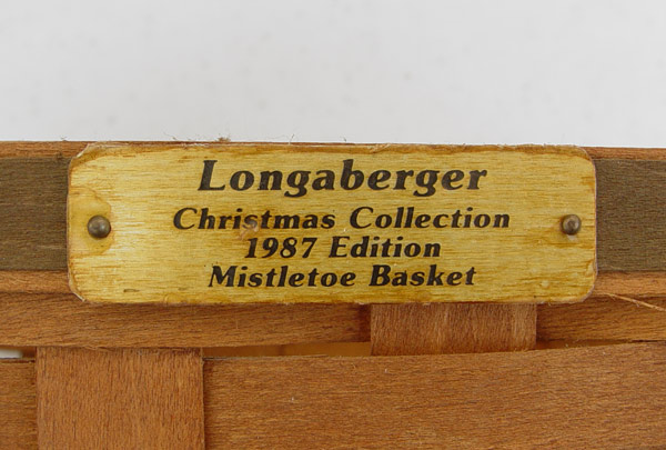 COLLECTION OF 6 LONGABERGER CHRISTMAS BASKETS: Christmas to include Christmas MAC 1987, Mistletoe TK 1987, Mistletoe KVM 1987, Christmas 1990 BAM, Happy Holidays JCM 1999, Christmas MLS 1992. Largest measures 15'' x 15'' x 10''