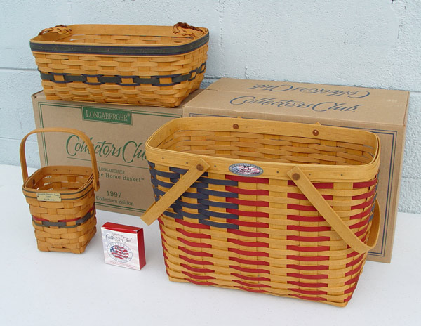 COLLECTION OF 3 LONGABERGER BASKETS: To include 25th Anniversary Collectors Club RLG 1998 with box, Bee basket TH 1997, Welcome Home AMB 1997 with box. Largest measures 11 1/2'' x 15 3/4'' x 8 1/2''.