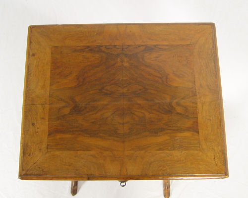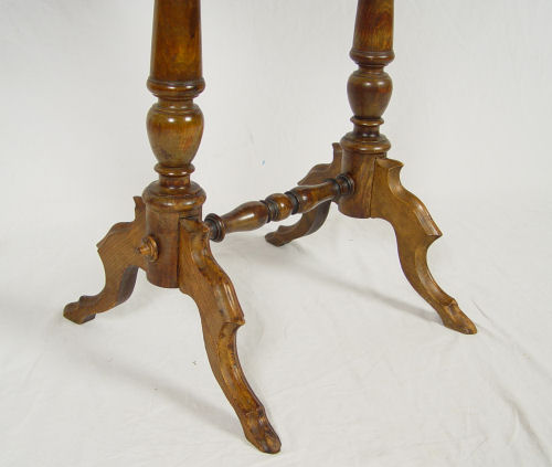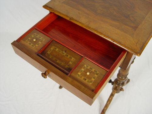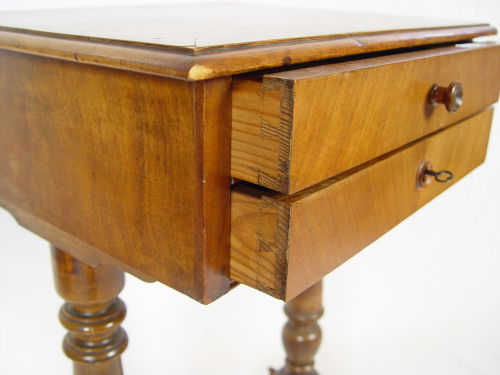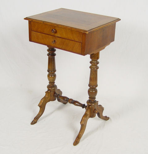 VICTORIAN SEWING STAND: Two drawer walnut stand with upper drawer having three compartments, one having a flip up pin cushion. Lower drawer locks with key. Turned legs. 29 1/2'' h. x 18 1/2'' x 15.