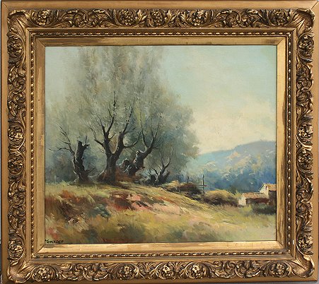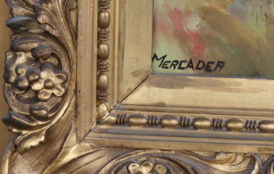 PANORAMIC LANDSCAPE PAINTING SIGNED MERCADER, GREAT FRAME: OIL/Canvas, 25'' x 31'', carved and painted gilt frame with wear, 35'' x 40''.