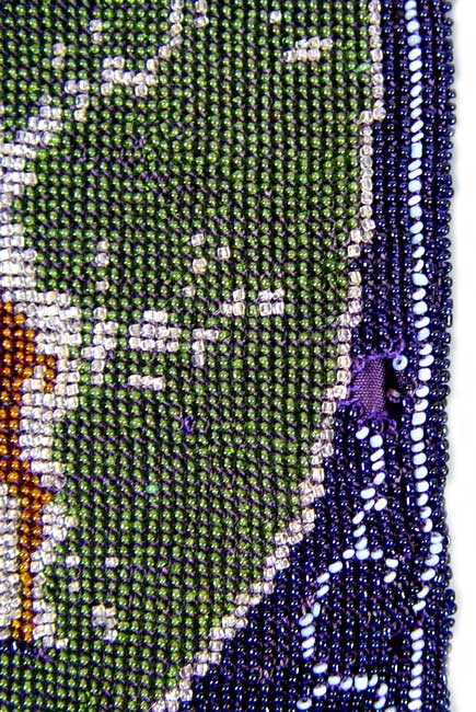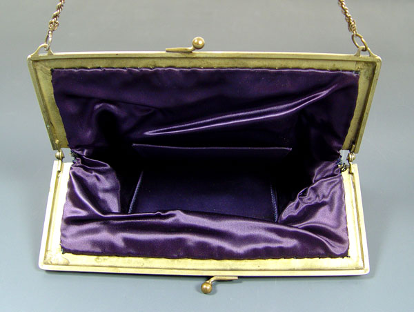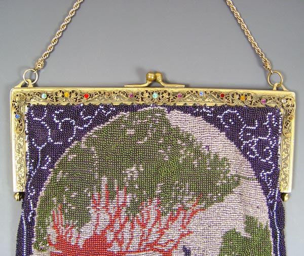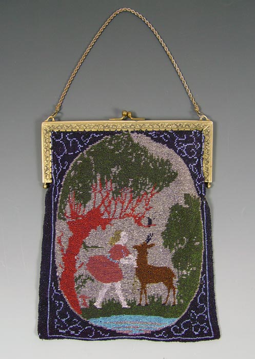 VINTAGE BEADED PURSE: Girl, deer and tree motif. Embossed metal frame set with colored stones, chain handle, satin interior. 10'' x 8''.