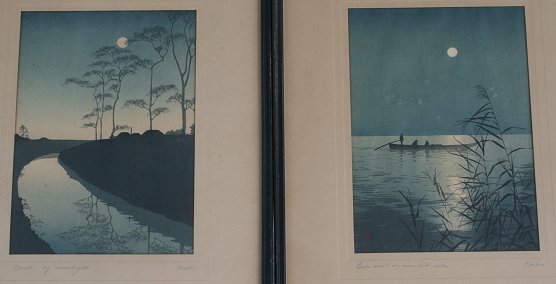 KOHO, Shoho, (Japan, 19th/20th C): Pair Woodblocks; ''Fishing Boat on Moonlit Sea'', ''Canal by Moonlight'', 9'' x 6 1/2'', framed, 16'' x 12''.
