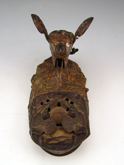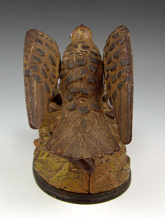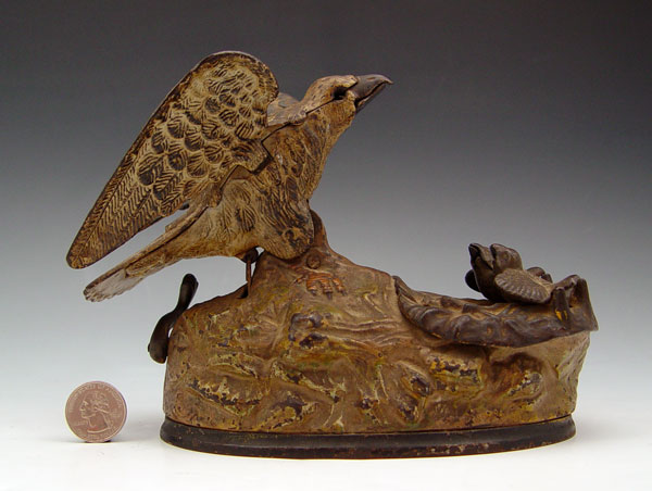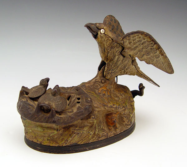 J & E. STEVENS EAGLE & EAGLETS MECHANICAL BANK : Movement works, marked Pat Jan 23, 1883. 6'' h. x 8'' x 3 3/4''