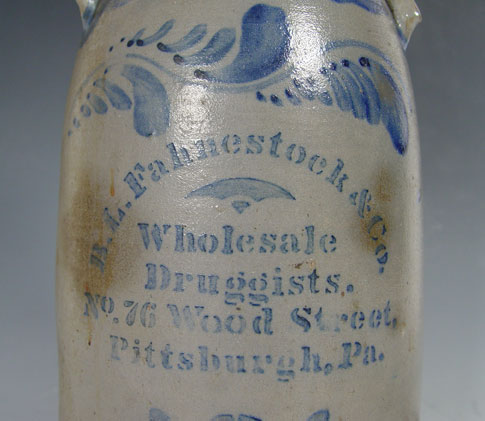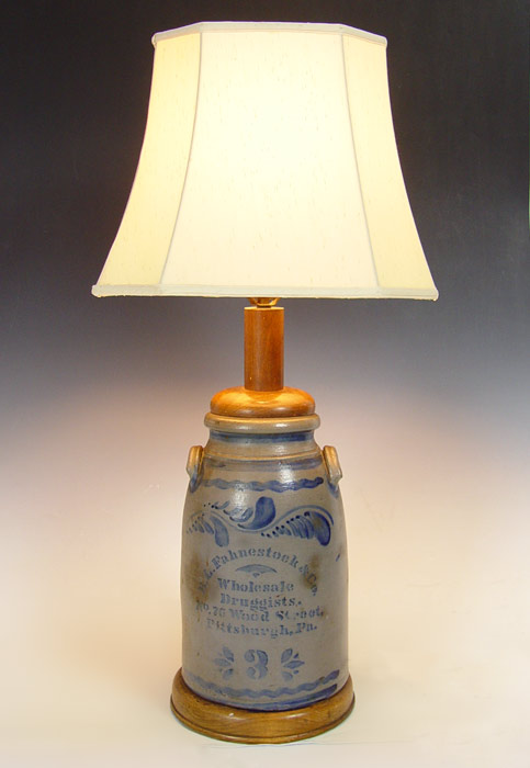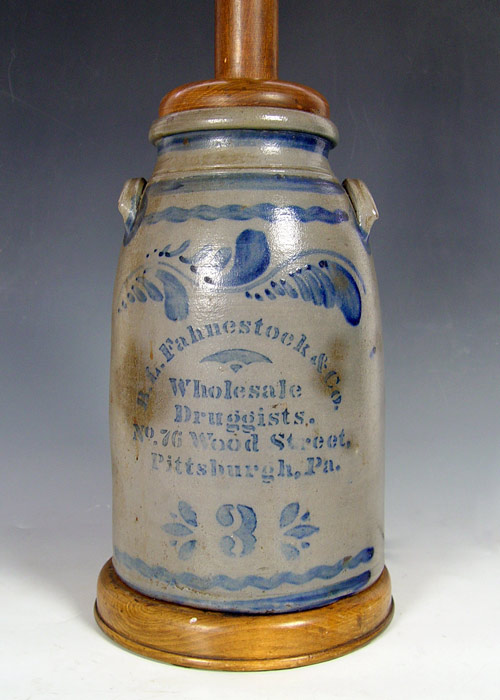 COBALT DECORATED STONEWARE PITTSBURG DRUGGIST ADVERTISING CROCK: Mounted as a lamp. B.L. Fahnestock & Co. Wholesale Druggists No. 76 Wood Street. Pittsburg, Pa. 3 gallon, the crock is 14 1/2'' tall, the lamp is 34'' overall.