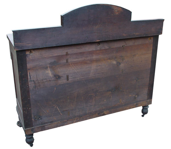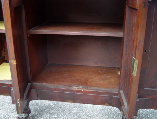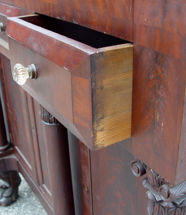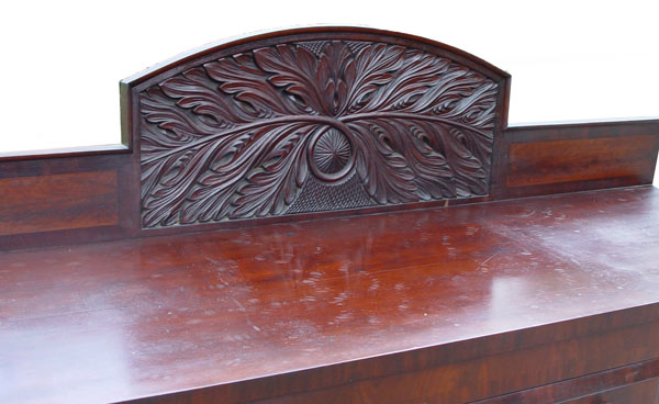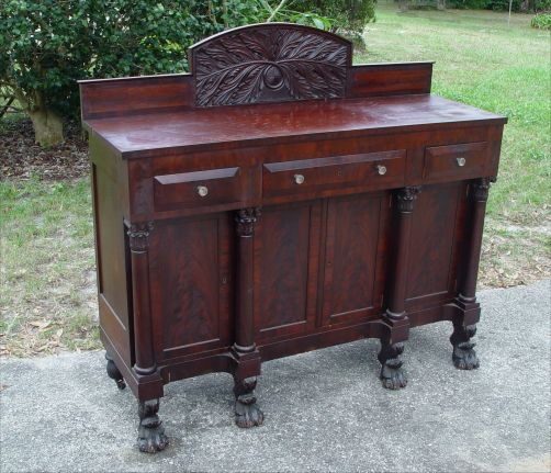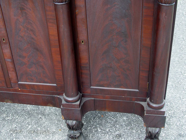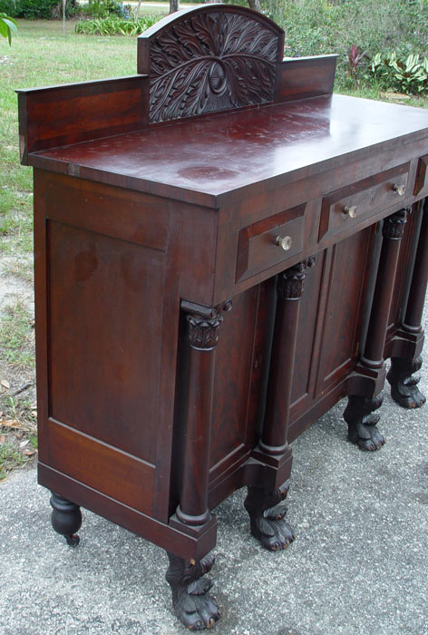 AMERICAN EMPIRE PERIOD SIDEBOARD: Featuring Carved crest and four columnar stiles with Corinthian capitals and carved lion paw feet. Richly grained mahogany veneer. 3 drawers overhang 4 doors. 5 ft 3.5'' long x 58'' tall x 24'' deep. overall.