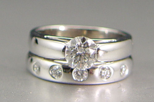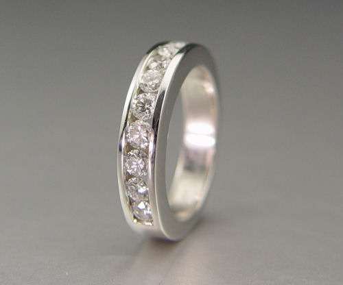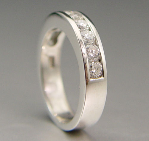 PLATINUM 10 STONE DIAMOND WEDDING BAND: Platinum brand contains ten round brilliant cut diamonds, approx. total weight 1.00 Ct. The diamonds average VS-SI in clarity and H-I in color and are channel set. Size 6.5. Weight: 10.6 grams.