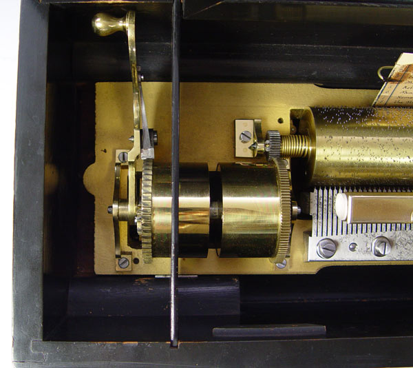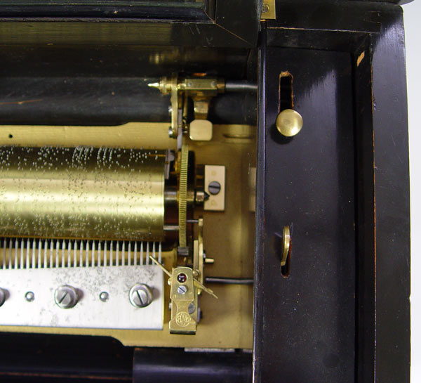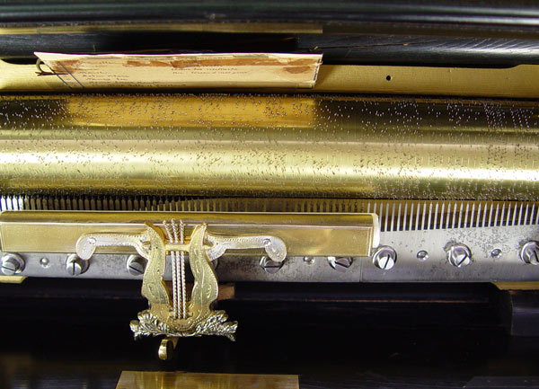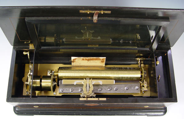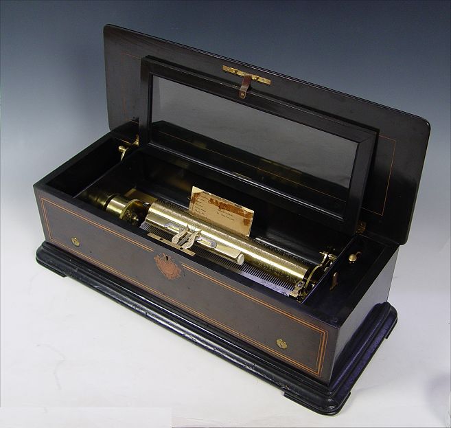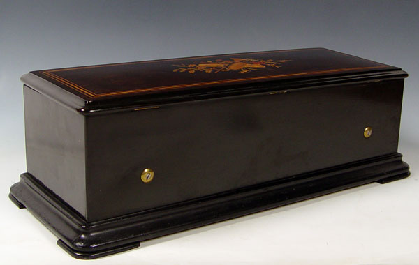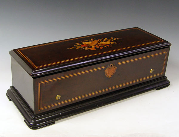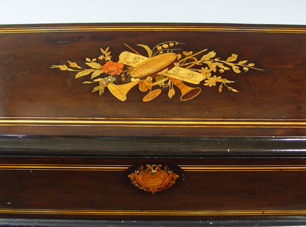B. A. BREMOND INLAY SWISS CYLINDER ROLL MUSIC BOX: String inlay with scroll, instruments and floral design on lid. Inlaid crest around lock. Plays 8 airs, no missing teeth. 8 1/4'' h. x 27'' x 11''.