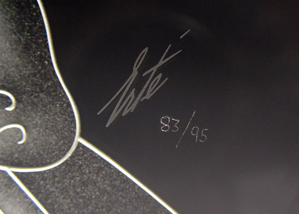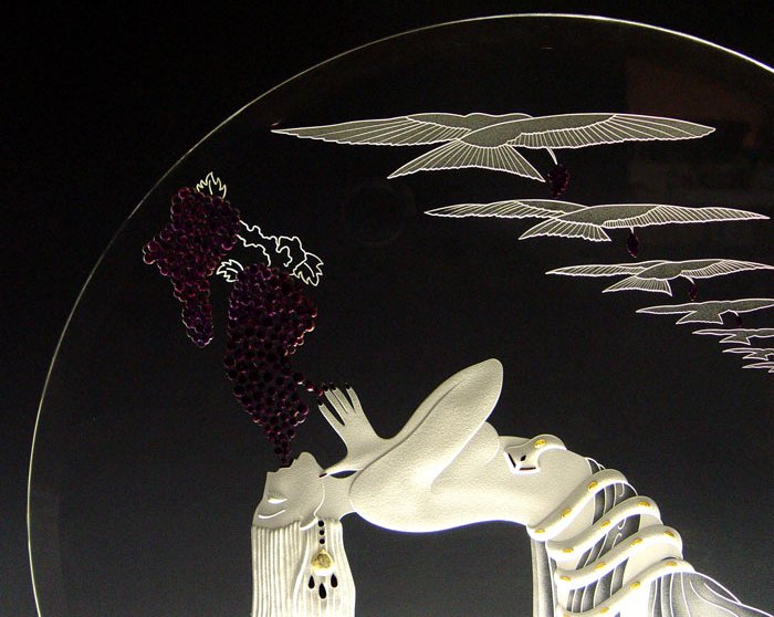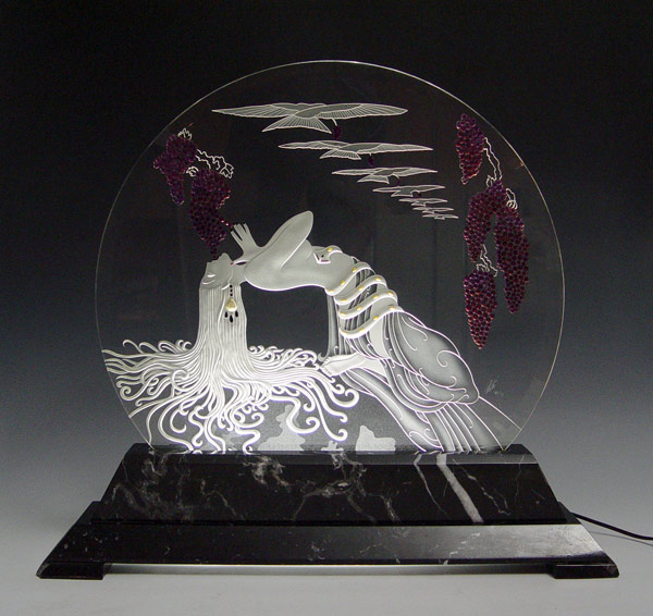 ERTE LUMINAIRE: Depicts a maiden eating grapes from the vine, 19 3/4'' h., 22'' (glass), made by Crystal Editions Inc., signed, numbered 83/95, marble lighted base 5 1/2'' h., 25 3/4'' w. (with chip to base as well as a fleabite on the glass.)