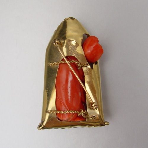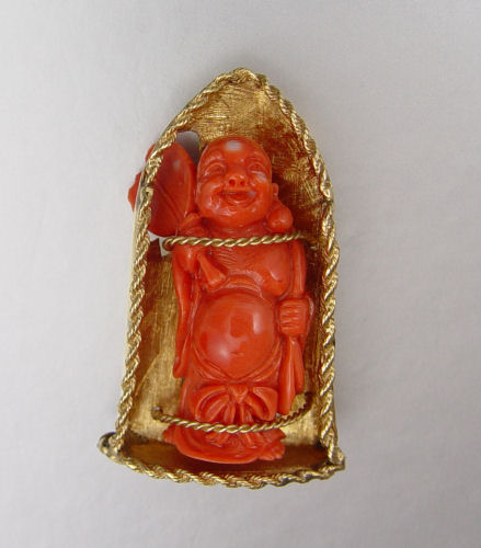 14K CARVED CORAL BUDDHA SHRINE BROOCH: As a free standing sculpture or a brooch. The 1 3/4'' carved coral Buddha is in a 14K yellow gold shrine. lease note the fan on Buddha has very small chips. 2 1/2'' tall overall.