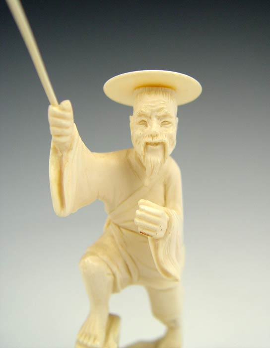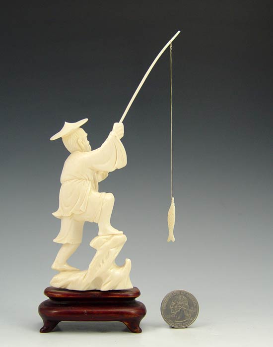 CHINESE CARVED IVORY FIGURE OF A FISHERMAN: Figure of man with fishing pole and fish on string. Mounted to wood stand. 7 1/4'' h.