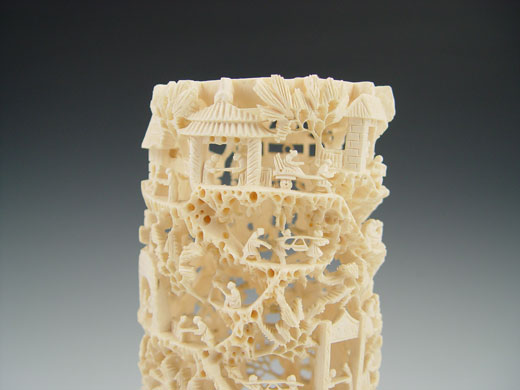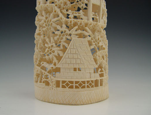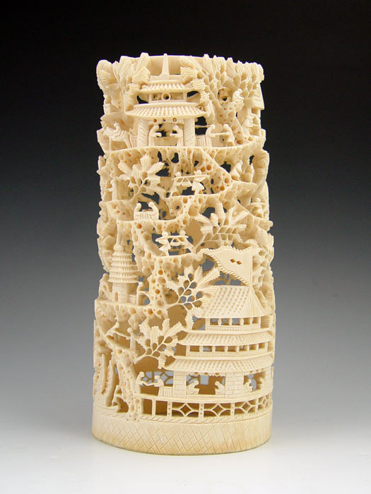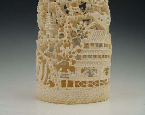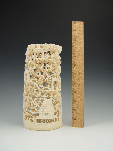 CHINESE CARVED IVORY TUSK VILLAGE: Carved and openwork with figures, buildings and trees. Carved from single piece. 9 1/4'' h. x 4 1/2'' x 3 7/8''.