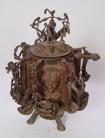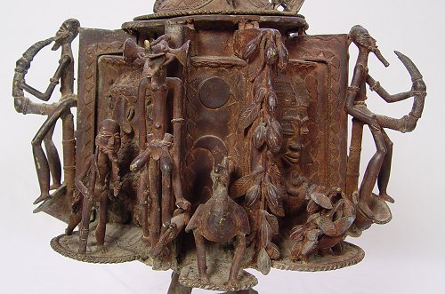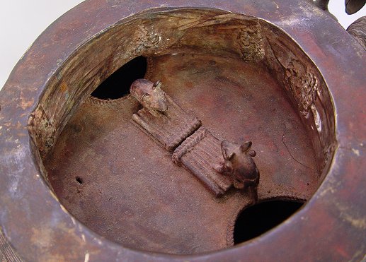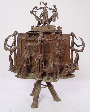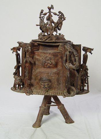 AFRICAN BENIN BRASS LIDDED FIRE POT SCULPTURE: 28 '' h., 21'' diameter, circa 1950's.