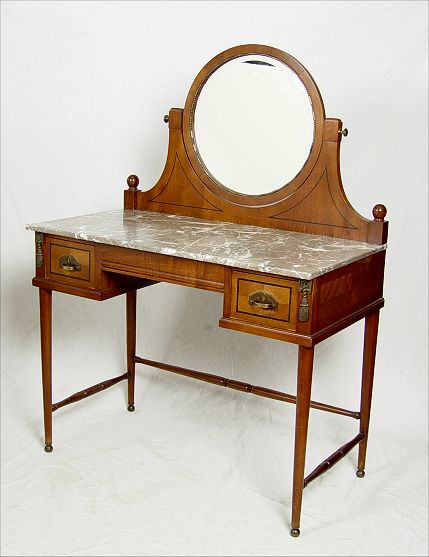 MAPLE MARBLE TOP DRESSING TABLE: Grey marble top with swivel round adjustable mirror backsplash. 2 drawers each side of kneehole. Turned legs with turned stretcher. Arts & Crafts copper drawer pulls. 55'' h. x 40 1/2'' x 22''