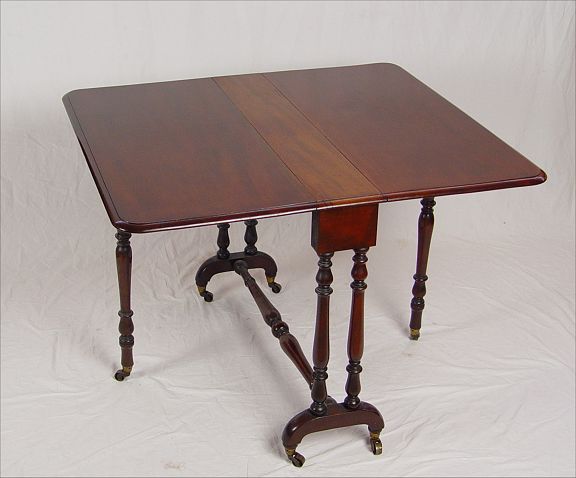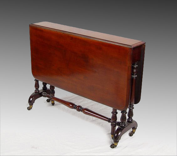 FINE ENGLISH SUNDERLAND TABLE: Slender mahogany drop leaf, swing leg table. Finely turned legs on brass casters, single stretcher. Overall fine condition with small splinter reglued on corner. 28'' tall x 7'' deep x 35''. Leaves are 17''.