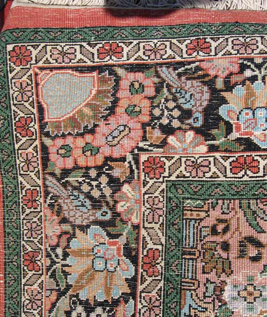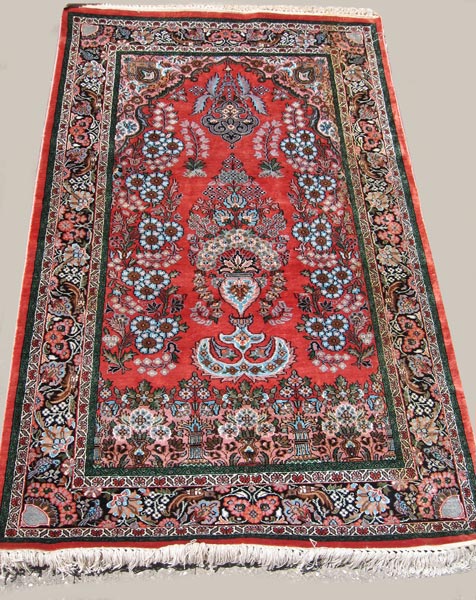 HAND TIED KASHMIR RUG: Approx. 3' 5'' x 5' 8'' Red ground, central flower urn design with foliate and bird border. Mercerized cotton.