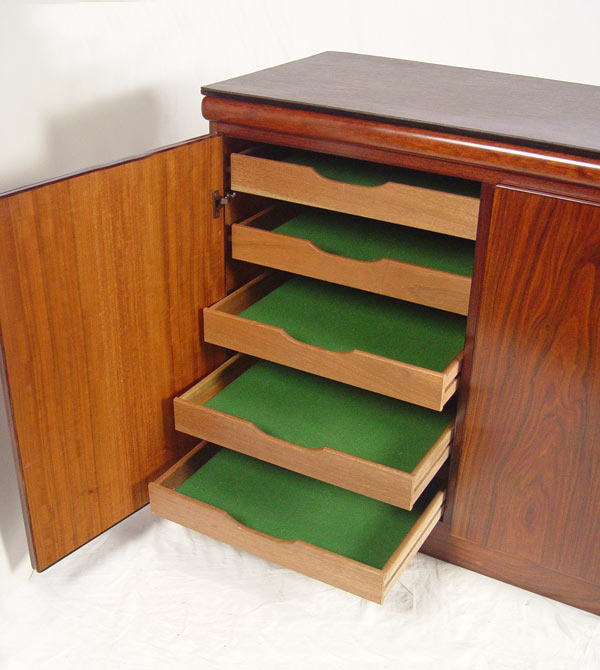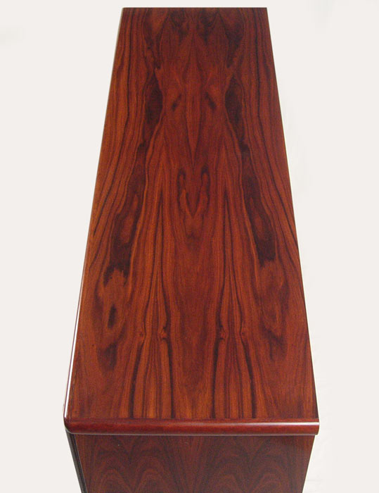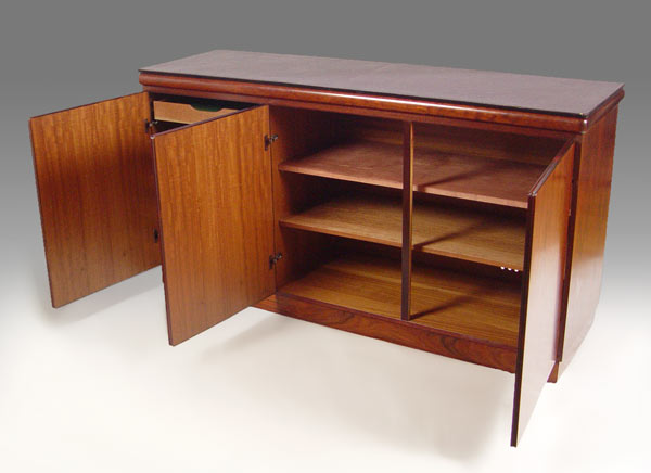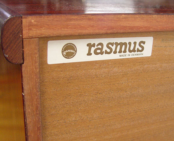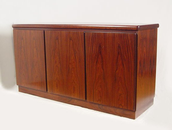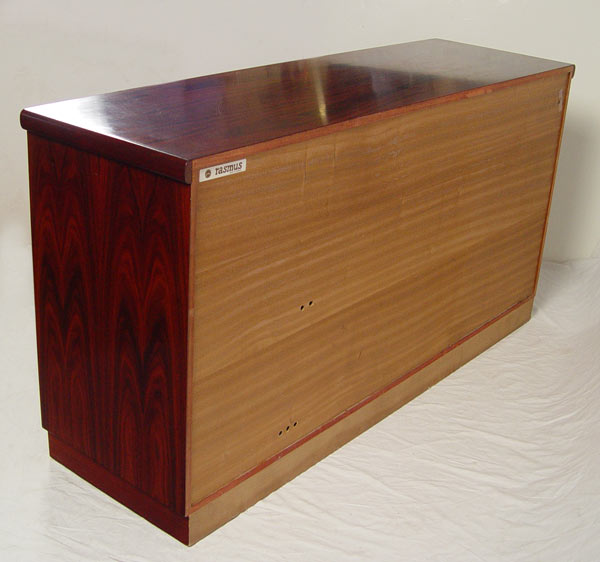 RASMUS DANISH MODERN ROSEWOOD VENEER CREDENZA: Three door sideboard. Adjustable interior shelves behind two doors, the other has felt lined pull out trays or drawers. 32'' h. x 31 1/2'' x 19''.