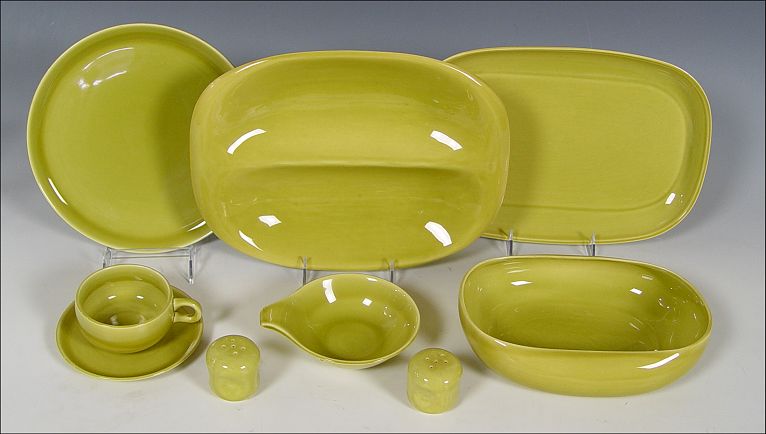 RUSSELL WRIGHT DESIGNED STEUBENVILLE AMERICAN MODERN DINNERWARE: Chartreuse, Ca. 1930's - 50's. 38 pieces to include 7 dinner plates, 8 bread plates, 5 lugged soup bowls, 8 cups, 5 saucers, 2 covered sugars, divided vegetable bowl (13.5'') oval platter (13.5''), serving bowl, and the salt and pepper shakers. Excellent condition.