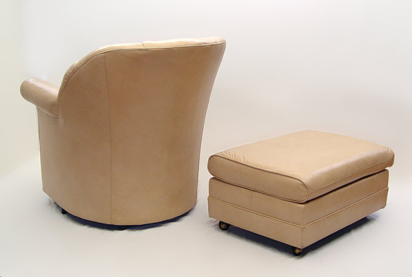 LEATHER CLUB CHAIR AND OTTOMAN BY HANCOCK & MOORE: Creamy leather swivel chair, and ottoman on rollers. Please note a small separation on the seam along the top rail. Chair is 33 1/2'' x 33'' x 36'' Ottoman 14'' tall x 27'' x 21''.