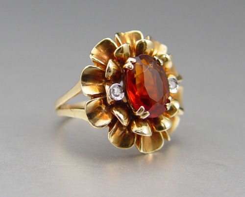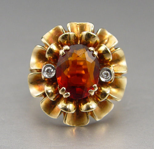 1940'S ROSE GOLD CITRINE AND DIAMOND RING: 14K rose gold floral motif ring centering an approx. 2 Ct. oval faceted citrine. The citrine is flanked by 2 single cut diamonds, approx. .04 Ct. Size 5.5. Weight 8.9 grams.