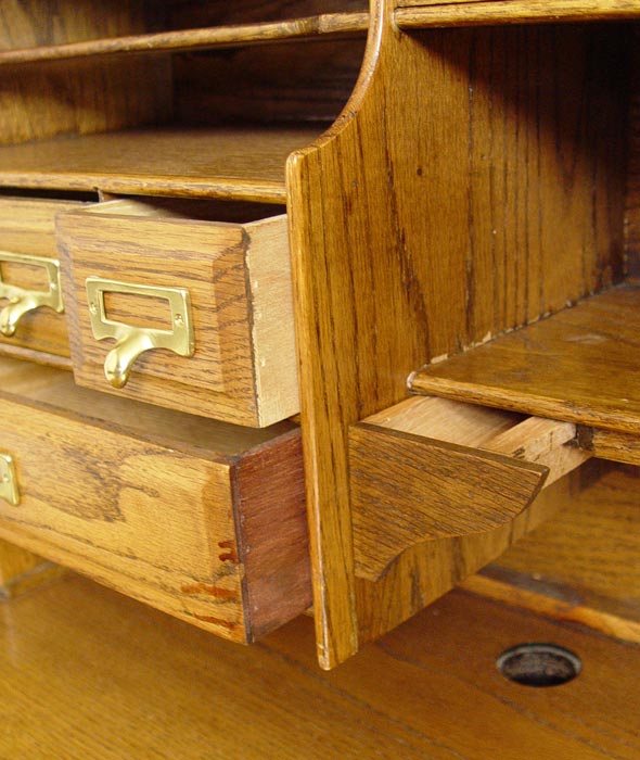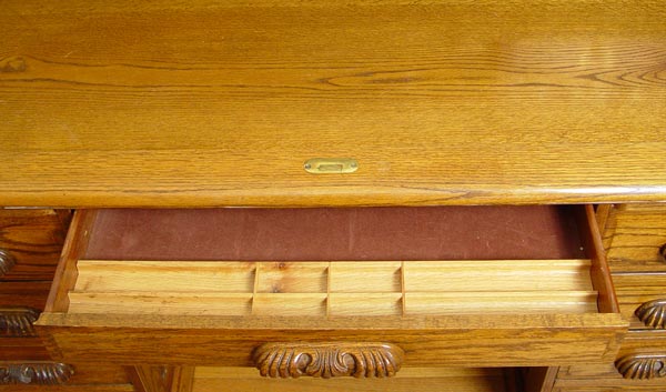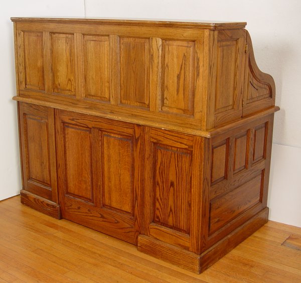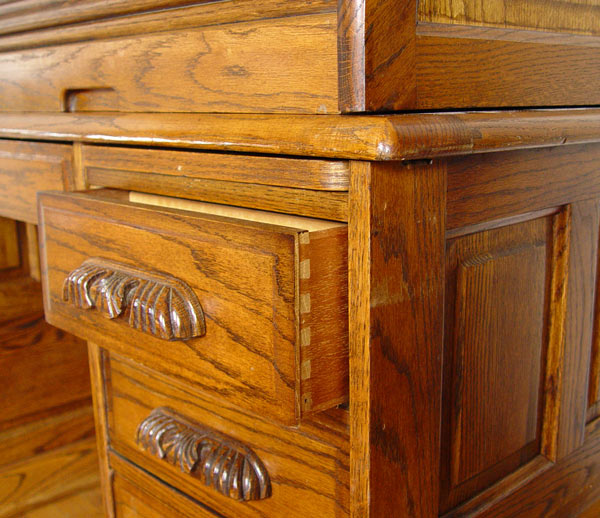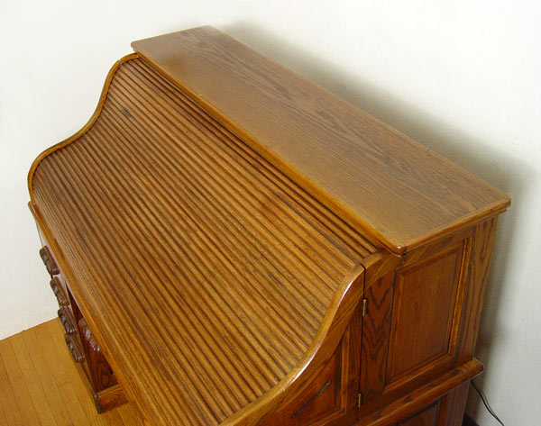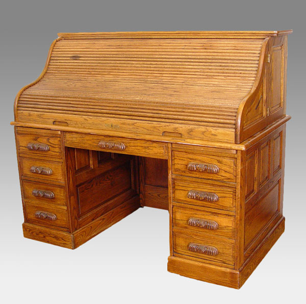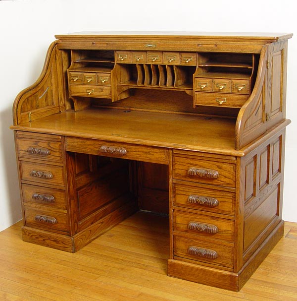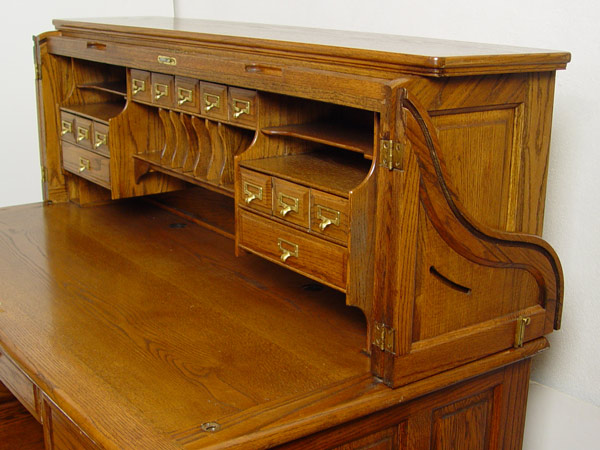 CONTEMPORARY AMISH MADE OAK ''S'' ROLL TOP DESK: Removable top has fitted interior with 13 file drawers, letter slots, and shelves. Base has two 4 stack drawers and wide pencil drawer. Raised panels. 50 1/2'' tall x 60'' wide x 33'' deep.