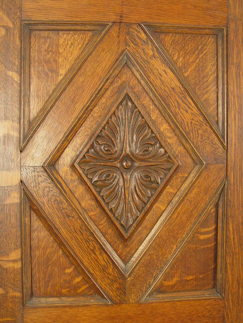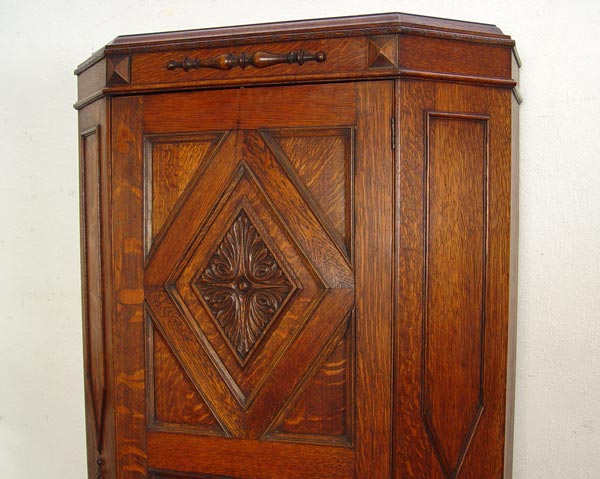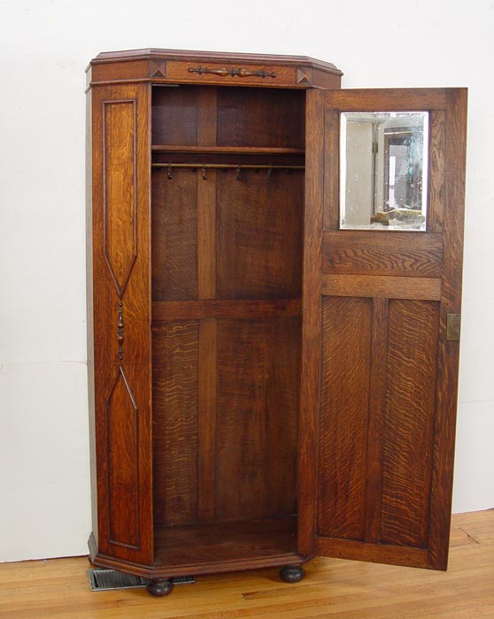 LATE VICTORIAN ENGLISH QUARTER SAWN OAK WARDROBE: Full length single door, canted sides, molded panels with central diamond pattern. Interior of door fitted with a beveled mirror. Single rod with clothing hooks. 75 1/2'' tall x 37'' wide x 15'' deep.