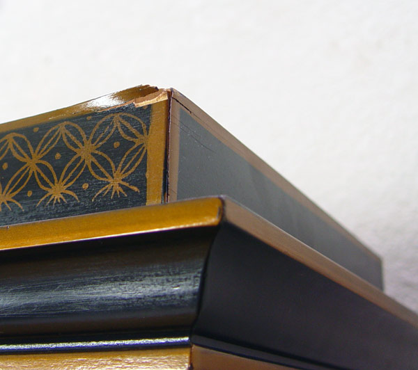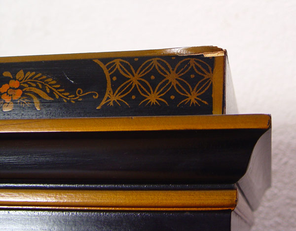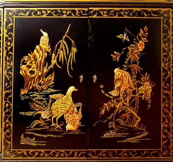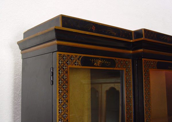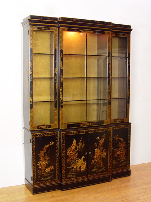 DREXEL CHINOISERIE DECORATED CHINA CABINET: Gold decoration on black ground. Upper section with glass doors, gilt interior with glass shelves. Lower section with doors and shelf interior. Please note splinter at top right. 80'' tall x 56'' x 14'' deep.