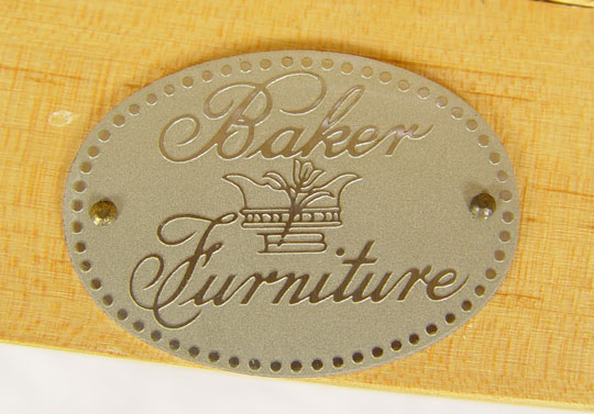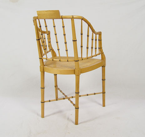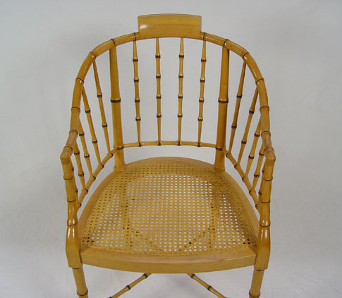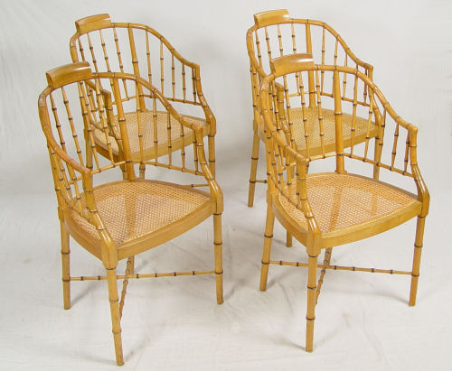 SET OF 4 BAMBOO STYLE ARM CHAIRS BY BAKER FURNITURE: Windsor type chairs with finely detailed bamboo carved spindles and cross stretchers. Caned seats. Please note one top rail has been professionally repaired. Metal Baker label. 35'' tall x 21'' x 21'' deep.