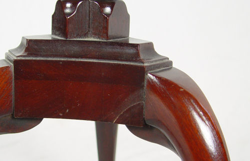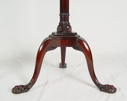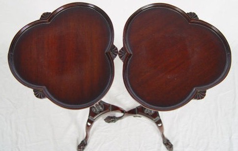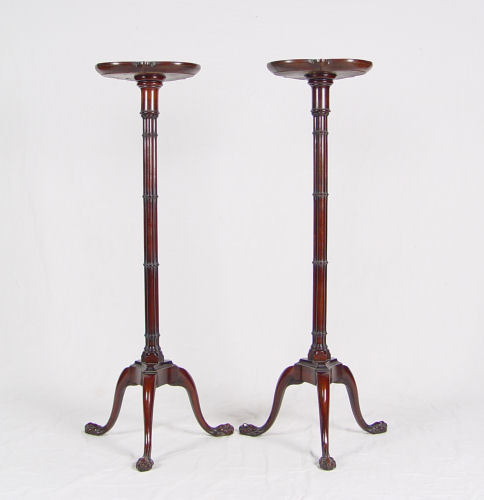 PAIR WEIMAN MAHOGANY FERN STANDS: Weiman Heirloom Quality Furniture of Rockford ILL. Clover form top on tall delicate faux bamboo triple pedestal supports on triple ball and fox claw feet. There is an older clean repair to one leg. 42 1/2'' tall x 17'' dia. at foot, 12'' dia. at top.