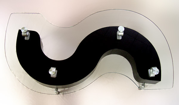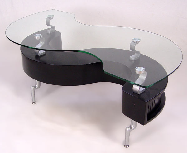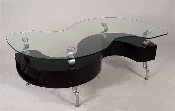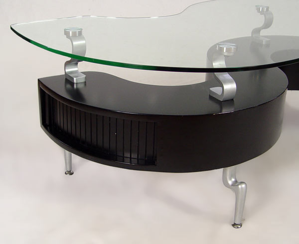 MODERN GLASS TOP COFFEE TABLE: S shape with glass top. Tambor drawer in body. Shaped metal legs. Measures 18 1/4'' h. x 51'' x 26 1/2''.
