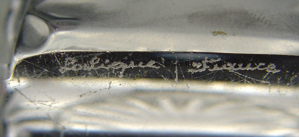 COLLECTION OF LALIQUE ASHTRAY & ORREFORS PERFUMES: To include 1) Signed Lalique France ashtray, note scratches on base. 1 7/8'' h. x 4 3/8''. 2) Orrefors perfume with frosted nude woman design. Note chip to stopper, scratches to base. 4 1/2'' h. x 2 1/4''. 3) Orrefors perfume, note scratches to base. 5 3/4'' h x 3''. 4) Unmarked cut glass perfume, 4 3/4'' h. x 2 1/2''.