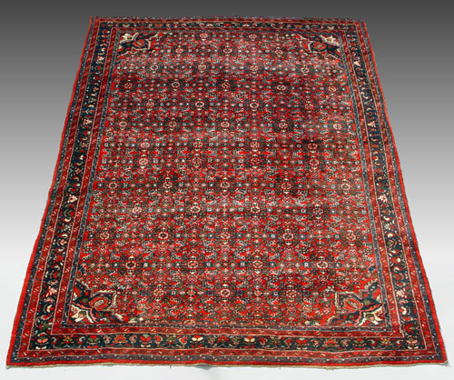 LARGE HAND TIED HAMADAN CARPET: Approx. 10'7'' x 7'10''. Red ground. Importers tag Avakian Brothers