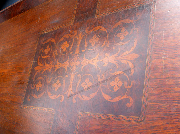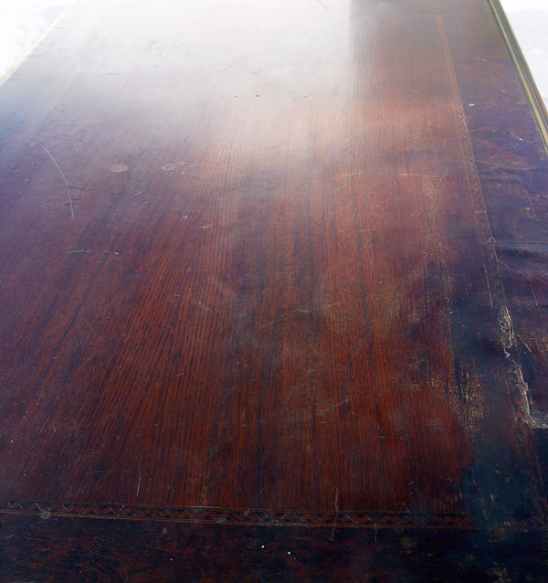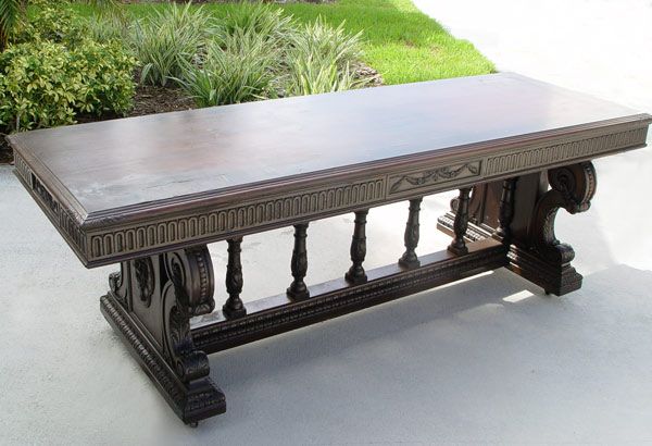 8 ft LONG HORNER TYPE CARVED MAHOGANY LIBRARY TABLE: Heavily carved trestles with gothic arched and columnar stretchers. Veneer inlaid top and ribbed apron. Please note there is some stress to the veneer. 8 ft long, 34'' wide x 32 1/2'' tall on casters.