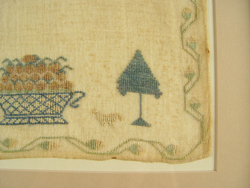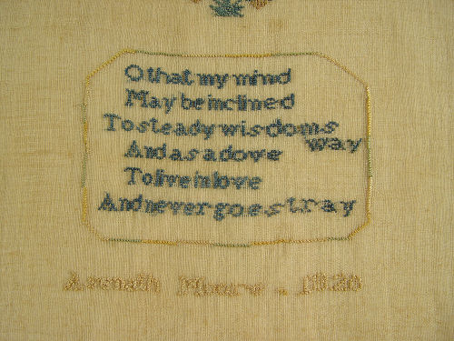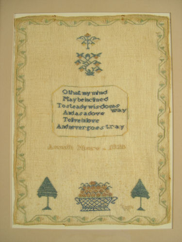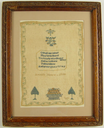 HAND WORKED SAMPLER DATED 1820: Worked by Asenath Moore. ''O that my mind May be inclined To steady wisdoms way And as a dove to live in love And never go astray''. Showing basket of fruit, trees and a berry vine border. The sampler is 16 1/2'' x 11 3/4''. Framed under glass in worn frame. Matted and hand stitched to acid free matte. 23 3/4'' x 19 1/2''.