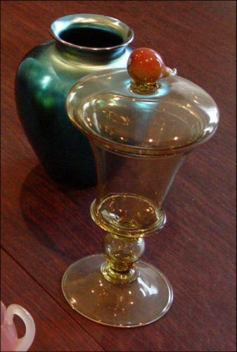STEUBEN GLASS COVERED JAR: Topaz color, shape 2945, with applied fruit finial. 11 3/4'' tall overall. Base is 5 1/4'' dia. Unsigned.